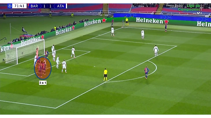 Рассмотрим гол Араухо с углового. Видим, что Кунде, Кубарси и Араухо нагружают дальний квадрат вблизи вратарской зоны. Причем у «Аталанты» всего один игрок остается контролировать данный участок – один против троих.