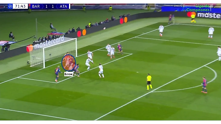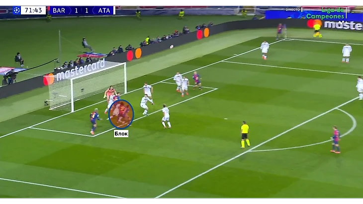 Отметим также и Феррана Торреса, который сдерживал своего игрока во вратарской зоне. Он вполне мог прочитать эпизод и попытаться выдвинуться на Араухо, чтобы заблокировать удар.
