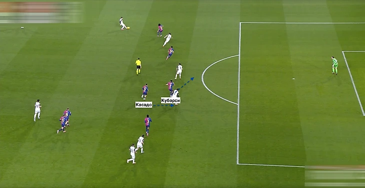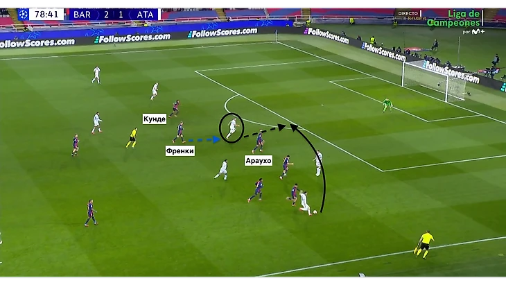 Таким образом, Кунде и Кубарси без особых проблем блокируют данного игрока, что дает возможность Араухо спокойно встретиться с мячом и отправить его в ворота.
