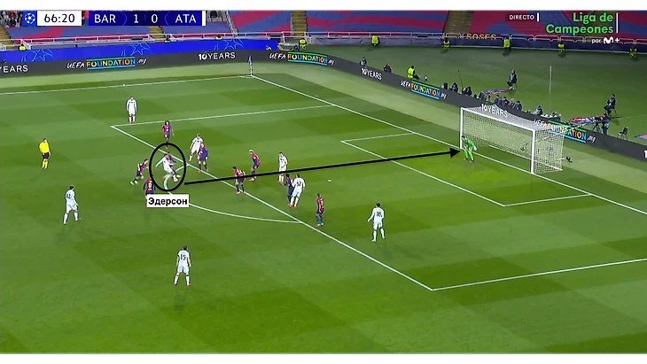 В финальной фазе атаки «Аталанты» игроки «Барсы» вполне могли нейтрализовать угрозу в опорной зоне. Но здесь на первый план вышли индивидуальные качества Эдерсона, особенно, хлесткий удар из-за пределов штрафной площади. Таким образом, «Аталанта» сравняла счет.