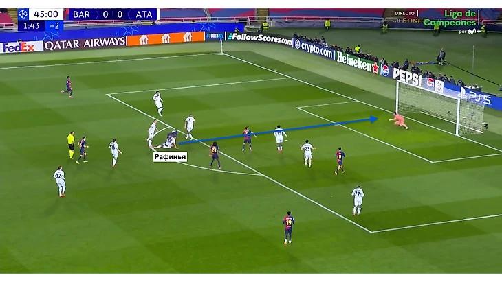 Рафинья пропускает передачу на него, делая вираж. Ложным открыванием он стянул за собой оппонента и на рывке атаковал открывшееся пространство впереди. Атака могла закончиться опасно, но мяч ушел в аут. Отметит и подключение Бальде из глубины.