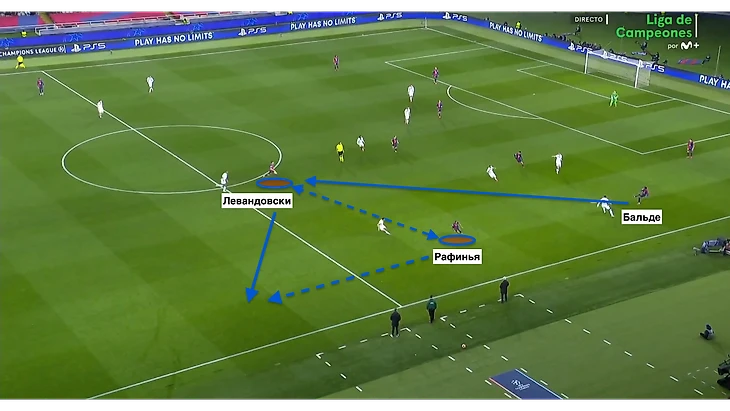 А теперь голевая атака «Барселоны». Снова мяч доставляется на Бальде, и мы видим тот же алгоритм действий Рафиньи и Левандовски. Отличие здесь в расстоянии между игроками. В данном эпизоде Рафинья расположен ближе к краю поля, что создает больше пространства Левандовски для приема мяча, а самой атаке придает максимальную ширину.