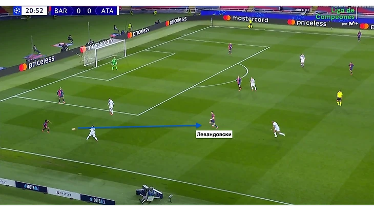 Однако по передаче отметим, что Левандовски уже остается свободен в центре еще на замахе – ЦЗ его бросает, для подстраховки своего партнера, играющего с Гави. При этом «Барселоне» все же удается перейти в среднюю треть поля и там закрепиться.