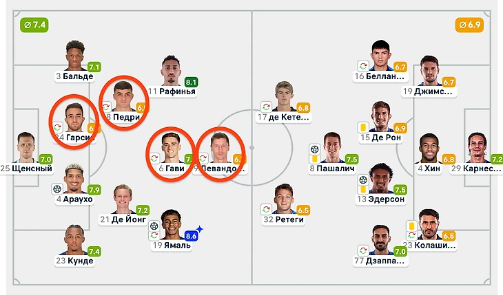 Ханси Флик дал отдых Пау Кубарси, и вместо него с первых минут в центре обороны вышел Эрик Гарсия в пару к Араухо. На позицию центрального атакующего полузащитника вернулся Гави, а в опорную зону Педри. В центре атаки в старте вышел играть Роберт Левандовски.