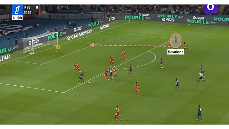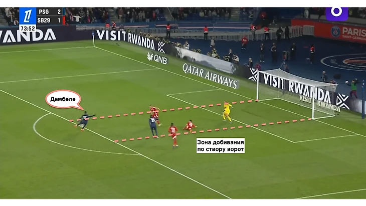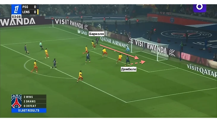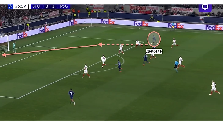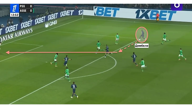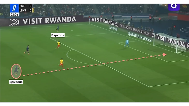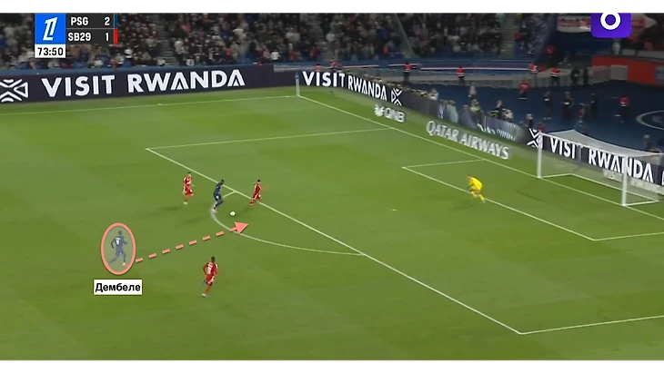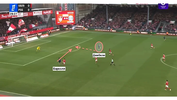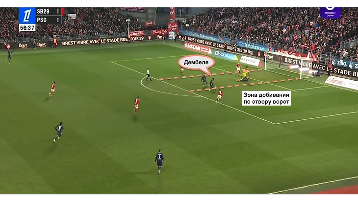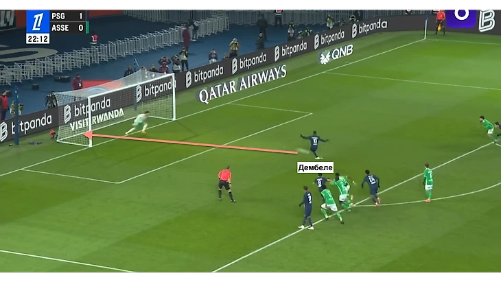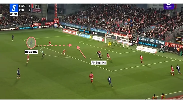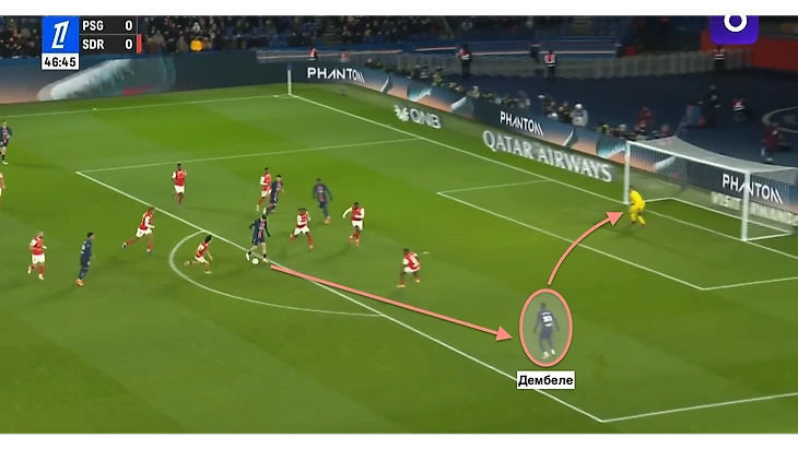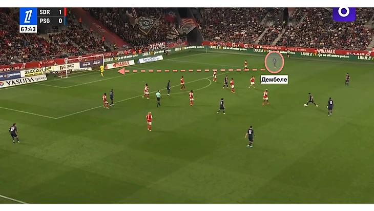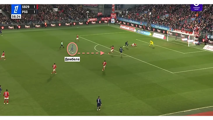 В матче с «Брестом» в первом круге Дембеле при контратаке располагается по створу ворот, что дает ему возможность на добивании оказаться в удобной позиции для удара по воротам.