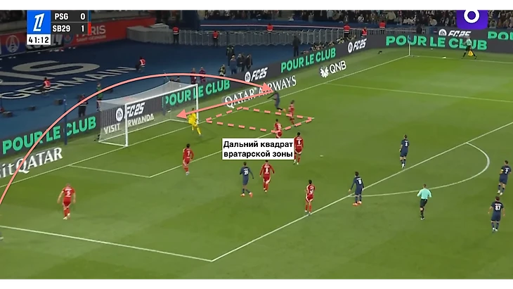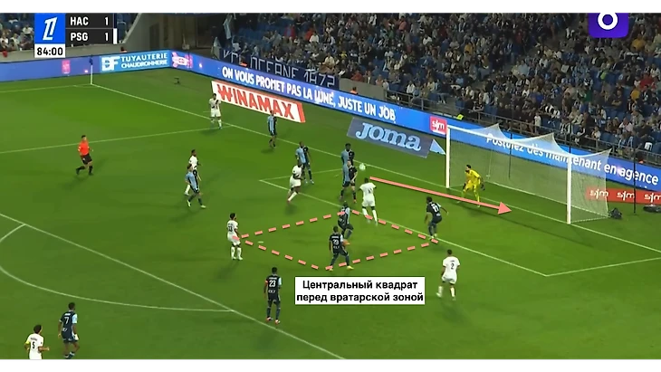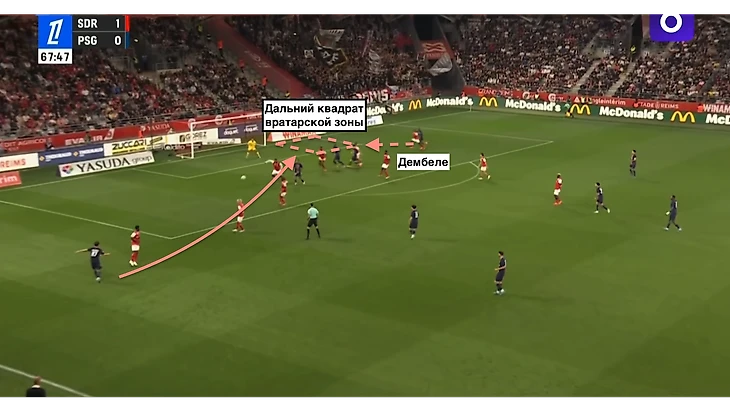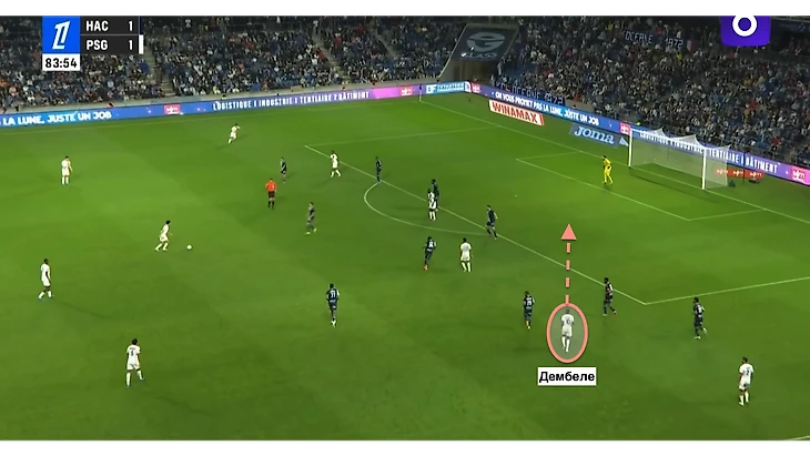 К примеру, в матче с «Гавром» мы видим, что Дембеле по мере продвижения атаки делает рывок с фланга на позицию в центральном квадрате вблизи вратарской зоны. Это позволяет ему своевременно открыться под заброс в данную зону и отправить мяч головой в ворота.