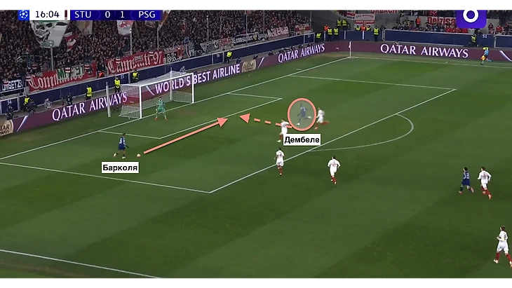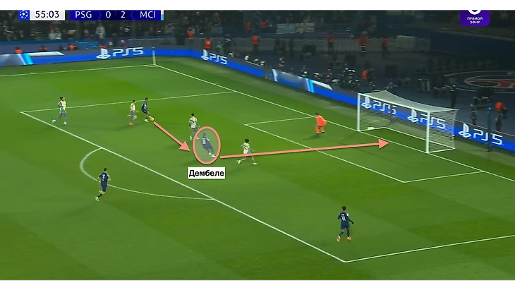 Тот же прием, что и в матче с «Лионом», Дембеле провернул в быстрой атаке на ворота «Сити» в ЛЧ. Только здесь он уже рывком поддерживал проход Барколя по флангу, а зайдя в штрафную резко сбросил скорость, оставшись в глубине. Так он сбросил с себя линию обороны соперника, которая продолжила опускаться ниже к воротам.