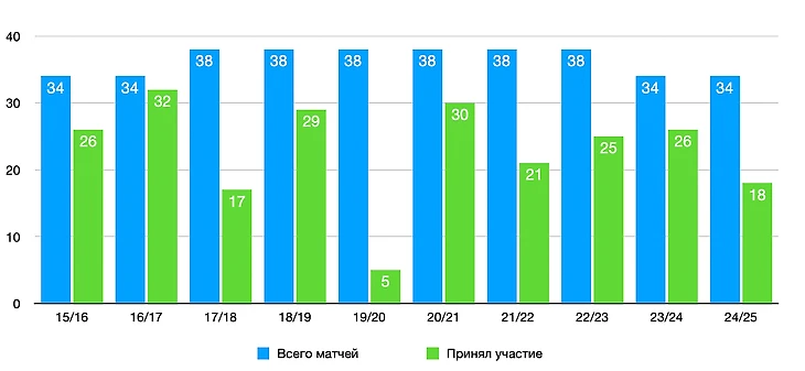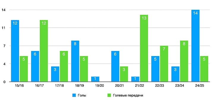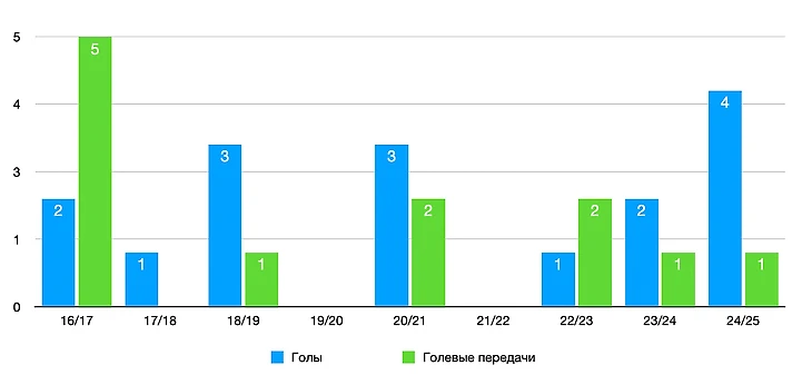 Наименее результативными вышли сезон 2019/20 и 2021/22. Там по голам и ассистам абсолютные нули за 4 и 3 сыгранных матча, соответственно. Больше всего матчей (11) в ЛЧ Дембеле сыграл в сезоне 2023/24. «ПСЖ» дошел до полуфинала, где проиграл «Боруссии Д» дома и на выезде. Всего за ту кампанию футболист набрал 2+1.