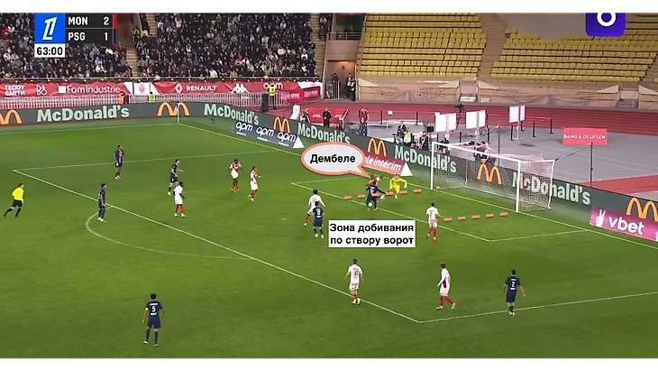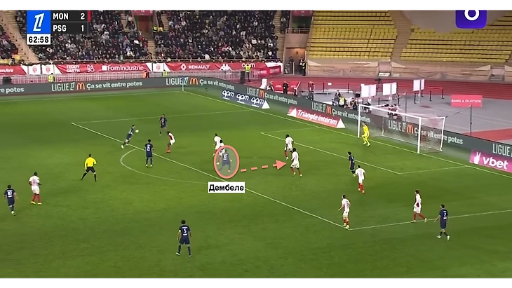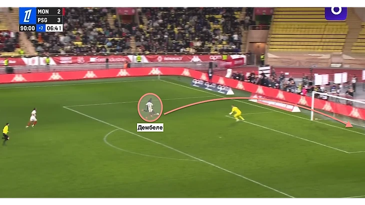 В игре с «Монако» при забросе с правого фланга от Хакими снова наблюдаем Дембеле в штрафной площади. Мяч прилетает к Фабиану Руису, который наносит удар. Вратарь отбивает, но на добивании по створу ворот первым оказывает Усман.