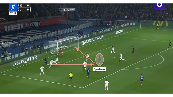 В матче с «Лионом» Дембеле играл на позиции форварда. На индивидуальный проход от Десира Дуэ Усман ответил выбором позиции в глубине штрафной, что позволило ему получить мяч от партнера и отправить его в ворота.
