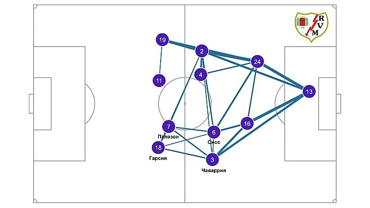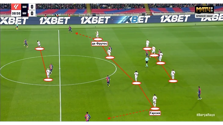 Вместо этого широкие позиции занимали фланговые полузащитники — по подключающемуся активно в атаку Бальде выдвигался крайний полузащитник «Райо» — де Фрутос. На противоположном крае, соответственно, то же самое.