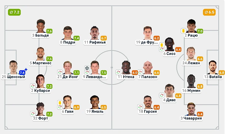 Фланг Ямаля работал не так эффективно. Возможно, сказалось присутствие Форта, с которым Ламин не так сыгран, как с Кунде. Кроме того, Ямаль часто ошибался в этой встрече, что приводило к потере мяча (22 — больше всех потерь в этом матче среди двух команд). Точность передач составила 69% при среднем значении в текущем сезоне 74,6%. Нанёс четыре удара по воротам, один в створ, упустил два голевых момента.
