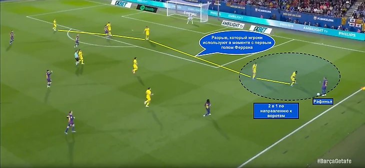 Первый гол Торреса тоже как пример: «Хетафе» в низком блоке. Здесь уже Рафинья сделал ключевую передачу на Дани в штрафную площадь. В отсутствии свободной изоляции для флангового игрока, футболисты совместно создали условия, чтобы вскрыть низкий блок соперника: Кунде рывок — открывает коридор для передачи на Ольмо — Ферран делает рывок лицом к воротам под скидку от Ольмо — гол.