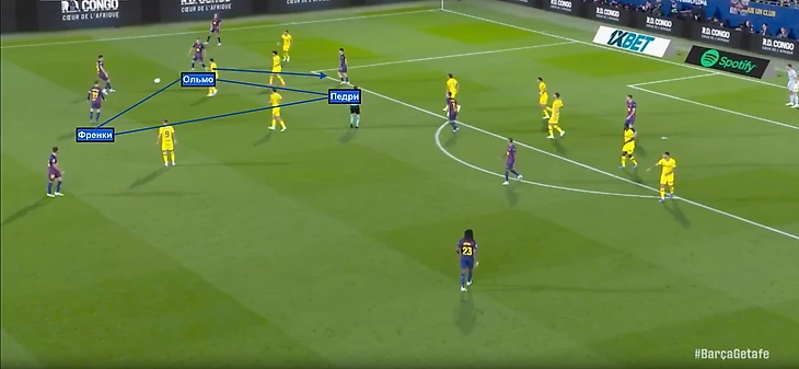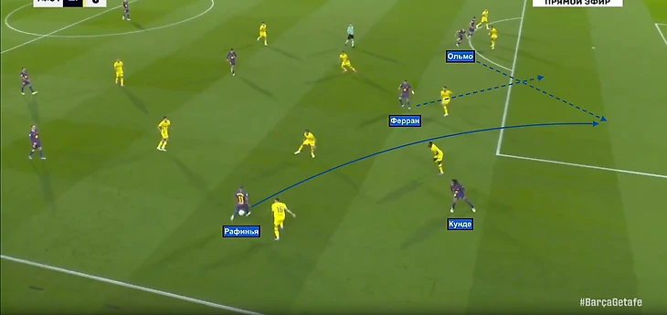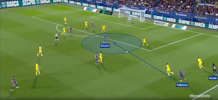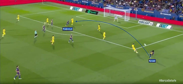 Вот почему «Хетафе» старался исключать свободы для фланговых игроков «Барсы». Здесь как только Кунде получил немного свободы, так сразу создал опасный прецедент своей передачей после приёма в штрафную площадь на Рафинью.