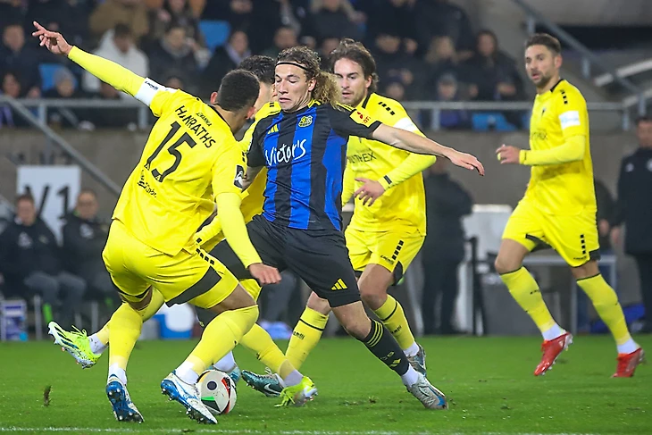 Якоб Левальд смотрит на то, как Омар Сиярич делает дубль забивая мяч боковыми «ножницами»