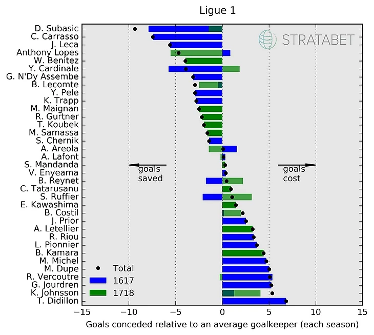 Он рассчитывается путем сравнения фактического количества пропущенных каждым вратарем мячей к числу целей, которые (гипотетически) средний вратарь мог бы предотвратить (на основе модели, описанной выше).