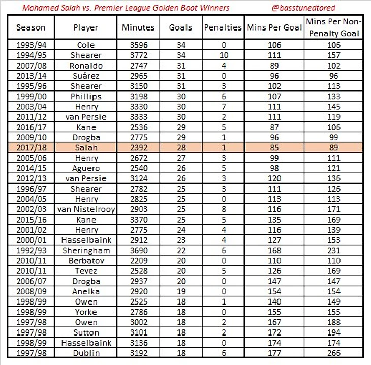 Салаху осталось отметиться ещё 7-ю забитыми мячами в 7-ми матчах, чтобы стать самым результативным игроком в истории АПЛ в одном сезоне.