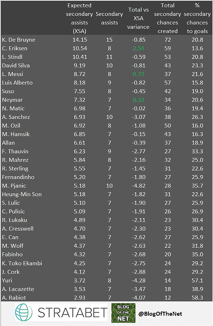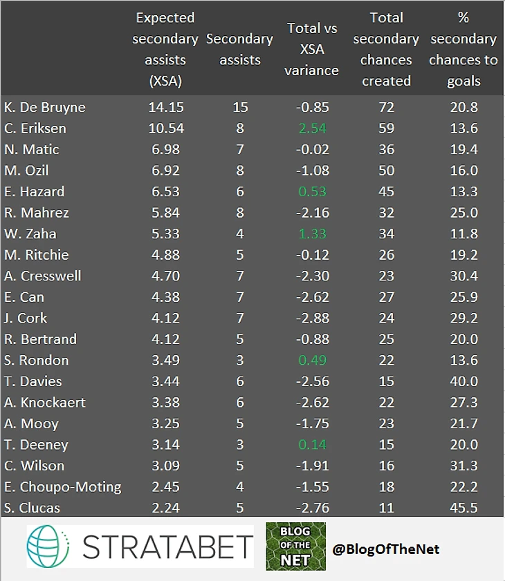 В приведенной ниже таблице показаны лучшие игроки АПЛ (по одному из каждого клуба) по предголевым передачам, а также по передачам, которые позволили партнёру создать шанс (secondary chances created)