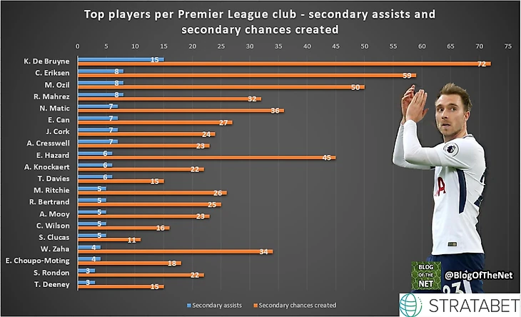 Кристиан Эриксен второй по secondary chances created и делит серебро с Озилом и Марезом по предголевым передачам (8).