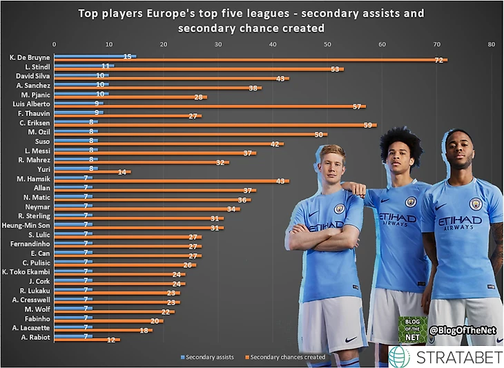 Игроки «Манчестер Сити» в этом списке: Де Брюйне, Давид Сильва, Рахим Стерлинг и Фернандинью. Лерой Сане сделал 11 ассистов, но имеет только 6 предголевых, поэтому в этом списке он отсутствует.