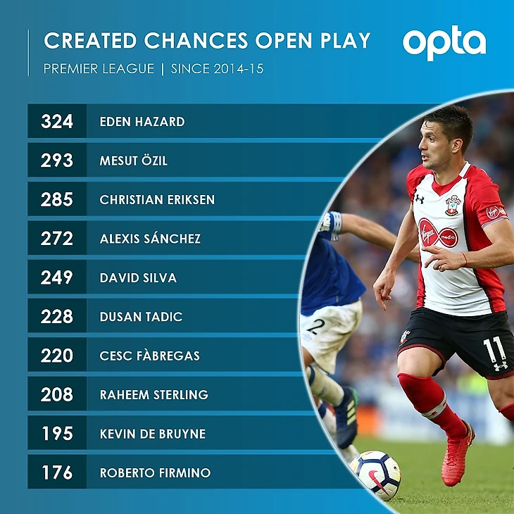 С момента своего дебюта в АПЛ (сезон 2014/15) Тадич уступает по количеству созданных шансов "с игры" лишь Азару, Озилу, Эриксену, Санчесу и Давиду Сильве.