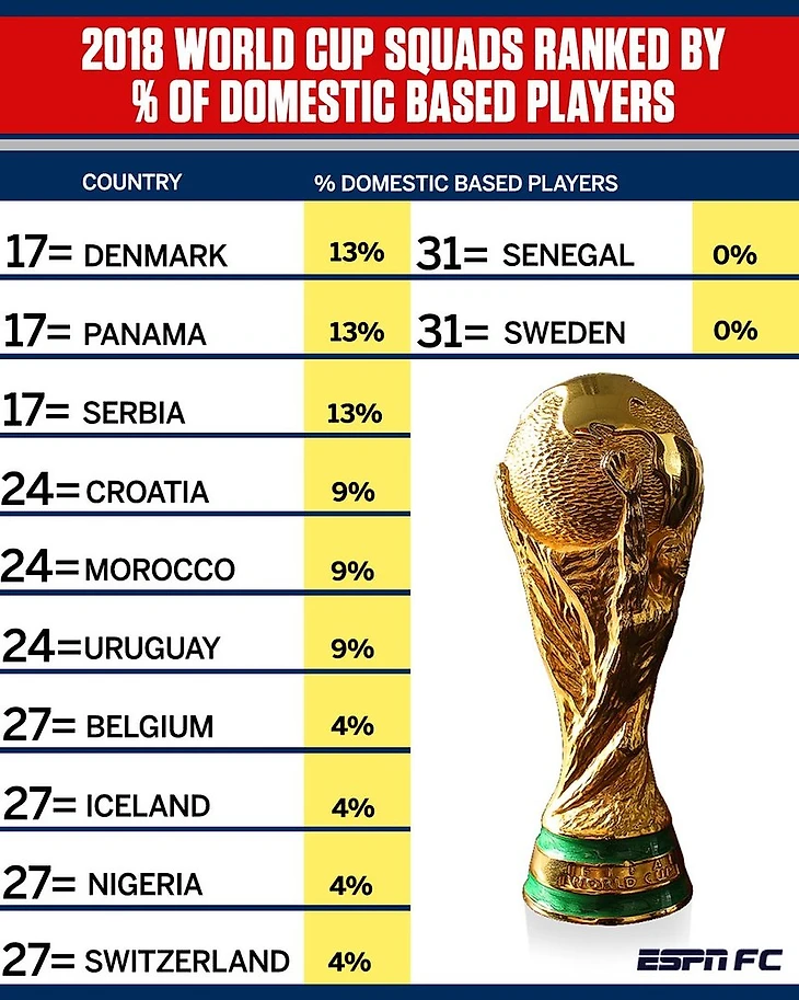 "Худшими" по этому показателю стали Сенегал и Швеция (ни одного представителя местной лиги).