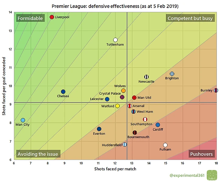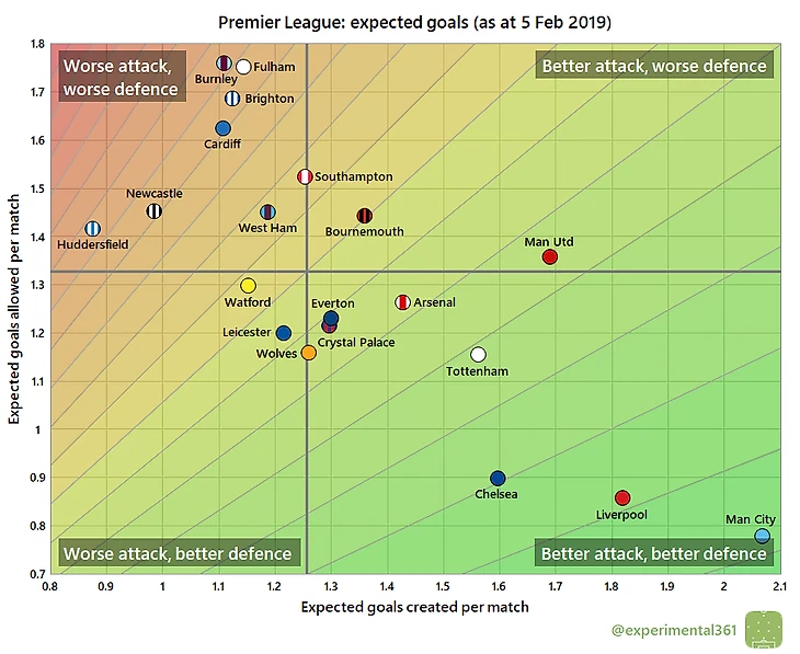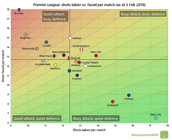 В данном материале вы сможете оценить выступление команд АПЛ сезона 2018/19 с точки зрения таких показателей как количество ударов, эффективность атаки, эффективность обороны и xG.