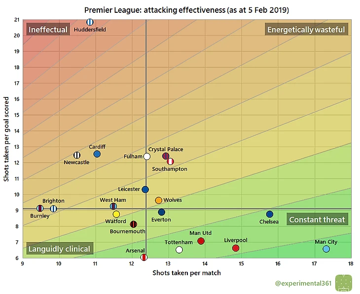 График показывает соотношение среднего количества ударов, необходимых для того, чтобы забить гол (вертикальная шкала) и среднего количества нанесенных ударов по воротам противника (горизонтальная шкала).