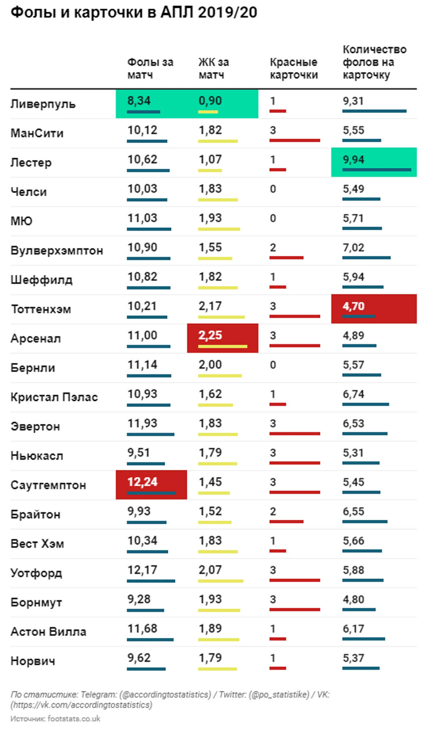 В среднем футболисты "Лестера" для получения карточки фолят 9,94 раз, что является лучшим показателем в лиге.