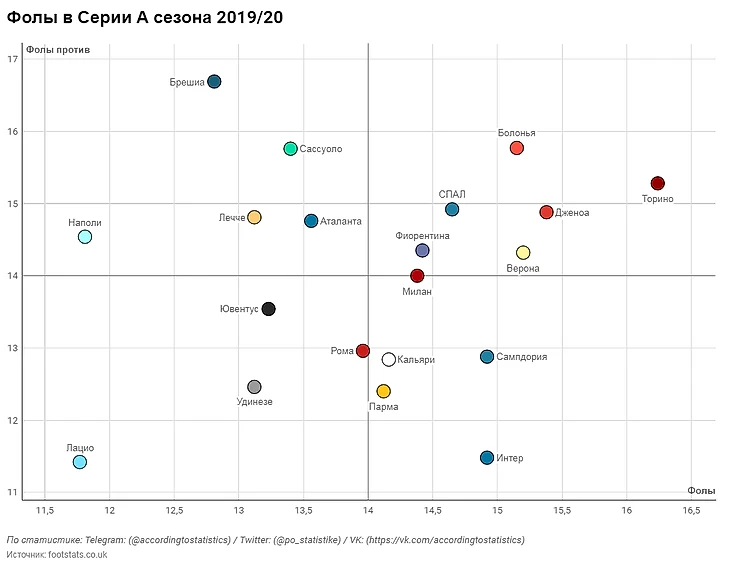Наименее фолящей командой лиги на данный момент является «Лацио» (11,77 фола в среднем за матч).