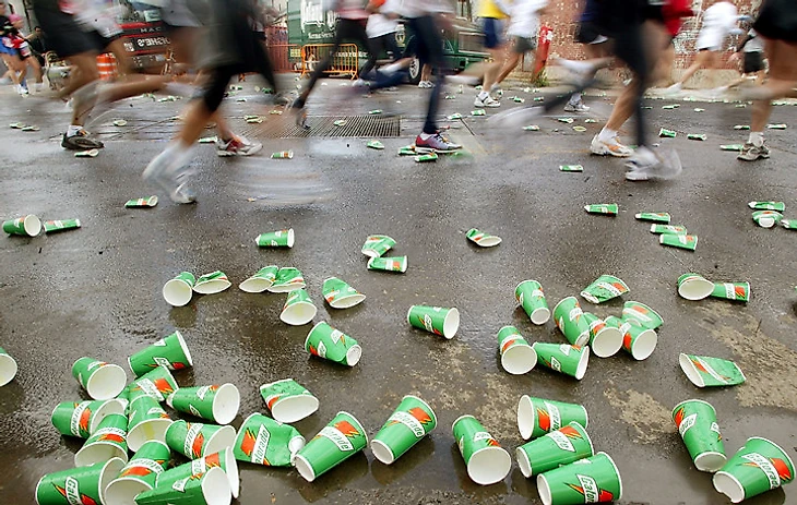 Каждую из 26 миль пути участник может завернуть на «пит-стоп», чтобы выпить воды. В итоге после марафона ежегодно приходится убирать более 2,3 млн бумажных стаканчиков.