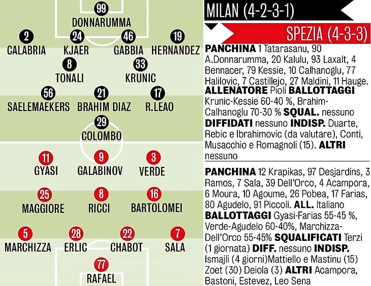 С одной стороны, мы все прекрасно видели по крайней игре с "Риу Аве" усталых Франка Кессье и Тео Эрнандеса, а также вялого Рафаэля Леау, вышедшего на игру с замены, которому еще предстоит набирать форму после двухмесячного простоя. С другой стороны, если Пиоли и вправду проведет массовую ротацию в игре со "Специей", то физическая форма миланцев не будет иметь абсолютно никакого значения по причине слабо наигранных связей между игроками резерва.