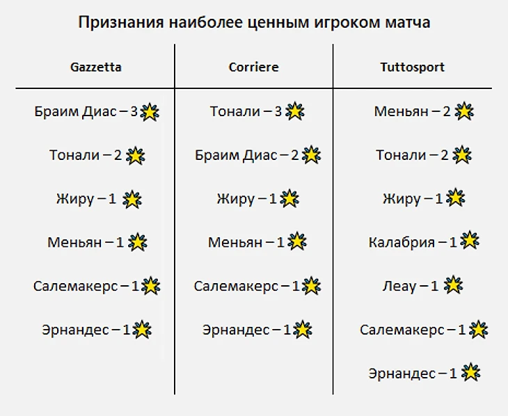 Примечательно, что от Gazzetta и Corriere Браим Диас в общей сумме получил пять званий MVP матча в сезоне, но от Tuttosport – вообще ни разу.