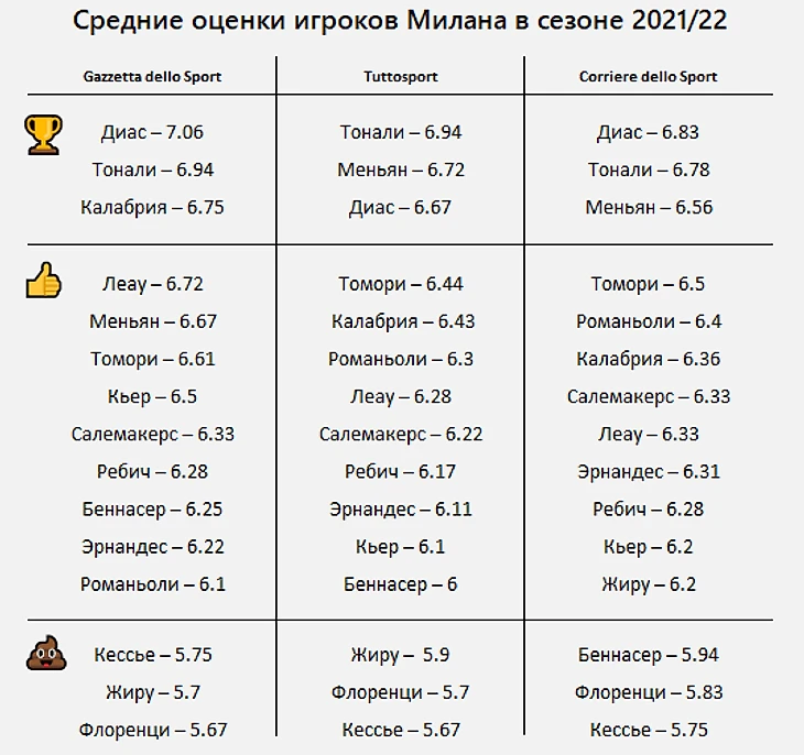 Рейтинг игроков «Милана» по средним оценкам от ведущих спортивных изданий Италии (Gazzetta dello Sport, Corriere dello Sport и Tuttosport): Браим Диас и Сандро Тонали в тройке лучших сразу у трех изданий, Франк Кессиэ и Алессандро Флоренци – в числе худших.