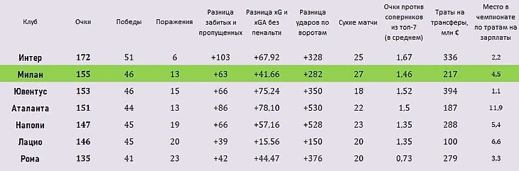 «Милан» под руководством Пиоли просто – 🔥: вторые по очкам (155), и лучшие по матчам на ноль. Во многом опережают «Юве»