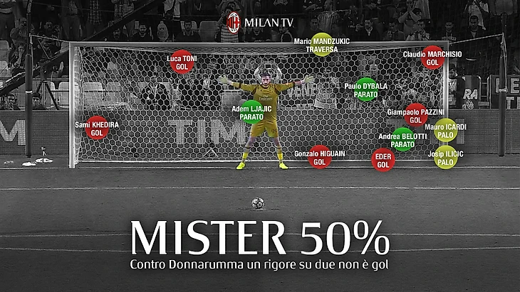 Доннарумма взял очередной пенальти. В этом сезоне в ворота «Милана» таковые назначались трижды. Дважды спасал Джиджи, а еще раз Йосип Иличич угодил в штангу. Но главным достижением, конечно же, было то, что этим сэйвом Доннарумма позволил команде остаться в игре, а также несколько психологически надломил соперника. Вашему же вниманию представляется наглядная инфографика отраженных в этом году пенальти в ворота итальянского вратаря (с учетом всех турниров)
