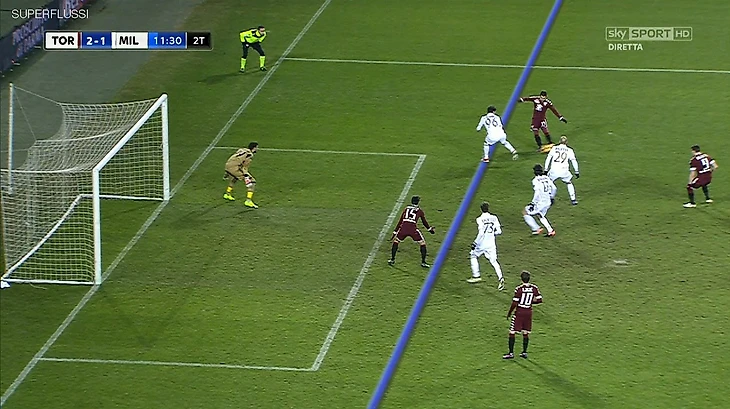 «Торино» убежал в контратаку, Белотти, протащивший мяч полполя, отдал его на набежавшего в штрафную Яго Фальке, оказавшегося совершенно брошенным Давидом Калабрия. Удар испанца был парирован Доннаруммой, а вот на добивании первым оказался Марко Бенасси и отправил мяч в ворота Джиджи, но благодаря вовремя отреагировавшего лайнсмена на офсайд итальянца, гол не был засчитан и тиффози «россонери» вздохнули с облегчением.