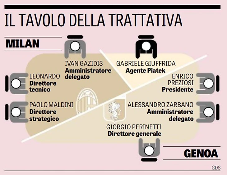Итак, в 17-00 в элегантном офисе известной студии в самом сердце квартала Четырехугольника Моды в Милане, началась встреча, на которой присутствовали: от «Милана»: Иван Газидис, Леонардо, Паоло Мальдини, от «Дженоа»: генеральный директор Джорджио Перинетти, исполнительный директор Алессандро Дзарбано, а также агент игрока Габриеле Джуффрида. В 18-00 к ним присоединился Энрико Прециози. С первых минут и с первых шуток атмосфера создалась благожелательная, но потребовалось более 3 часов напряженной работы, чтобы прийти к каким-то приемлемым для сторон результатам.