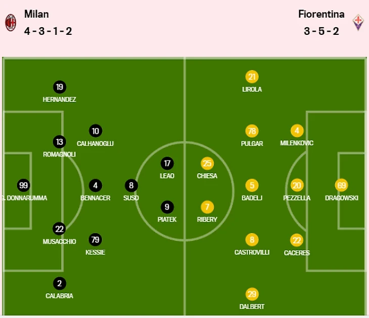 Гарантировано встречу пропустит центральный защитник «Милана» Кальдара – он вернется в строй не раньше конца октября. А вот хавбек «россонери» Пакета и защитник «фиалок» Расмуссен хоть и возобновили тренировки в общей группе, но также вряд ли появятся на поле в данной встрече.