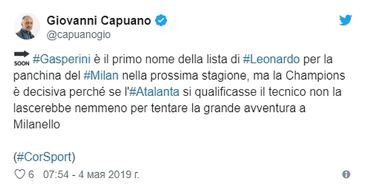 "Милан" хочет нанять главного тренера "Аталанты" Джан Пьеро Гасперини, сообщает в своем Твиттере журналист Джованни Капуано со ссылкой на Corierre dello Sport. Сообщается, что специалист находится на первом месте в списке спортивного директора россонери Леонардо. Однако все будет зависеть от того, как завершится сезон. Если "Аталанта" пробьется в Лиге чемпионов, то специалист, вероятнее всего, останется в команде. Ранее сообщалось, что "Милан", вероятно, покинет по окончании сезона главный тренер Дженнаро Гаттузо. "Аталанта" с 59 очками на данный момент идет четвертой в чемпионате Италии, у "Милана" 56 очков и седьмое место.