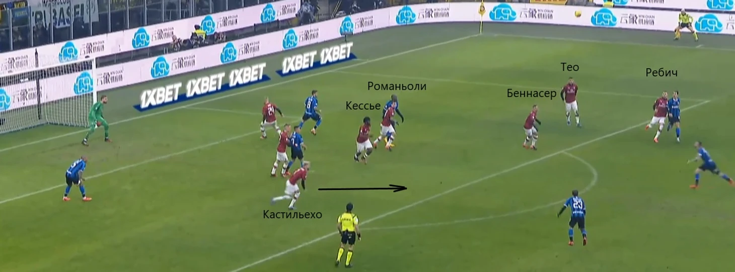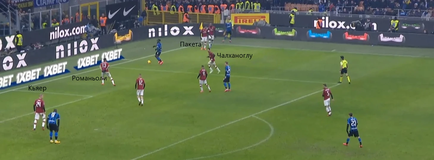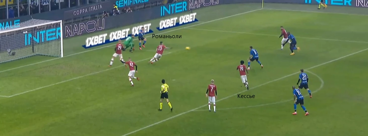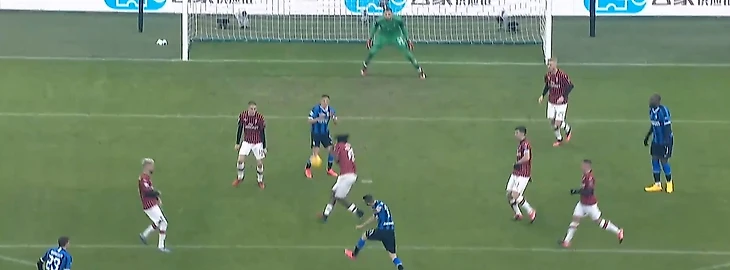 "Милан" в последние минуты отчаянно пытался что-то придумать у ворот соперника, и нарвался на контратаку, приведшую к добиванию контрольным выстрелом в исполнении Лукаку. Брозович сместился во фланг, уведя за собой Пакета и Леау. Хорват слишком легко толкнул мяч вперед на забежавшего Мозеса (Пакета почему-то даже не выставил ногу, чтобы прервать эту передачу).