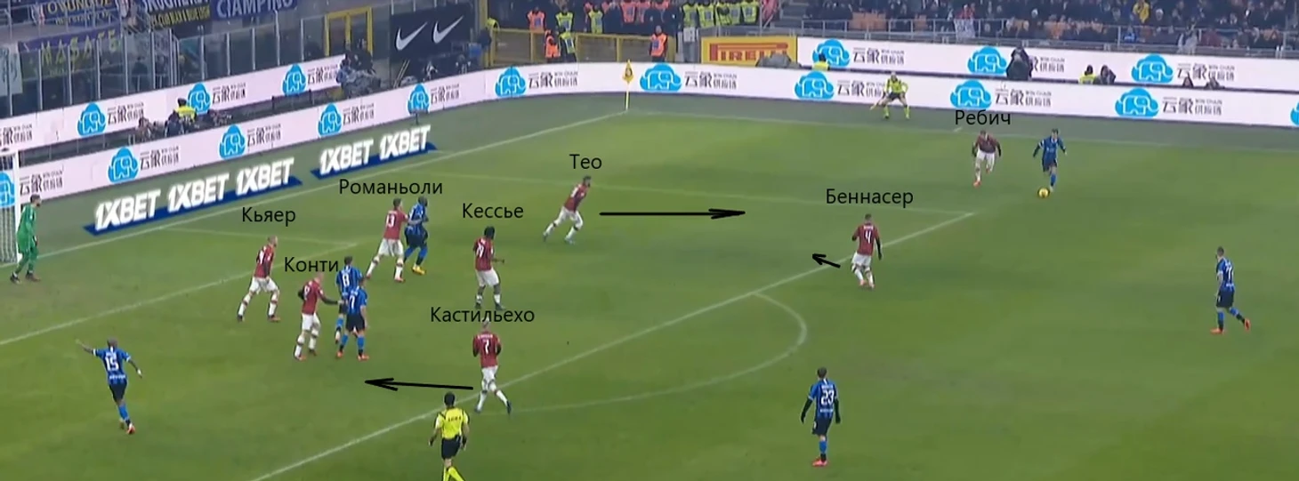 При этом Беннасер зачем-то смещается влево полушагами (хотя скорее всего он видел переферическим зрением рывок Тео). В этом эпизоде Исмаэль был обязан сделать небольшое отклонение в правую от себя сторону, чтобы сократить пространство для Кандревы, и успеть встретить Брозовича в случае, если он получит мяч.