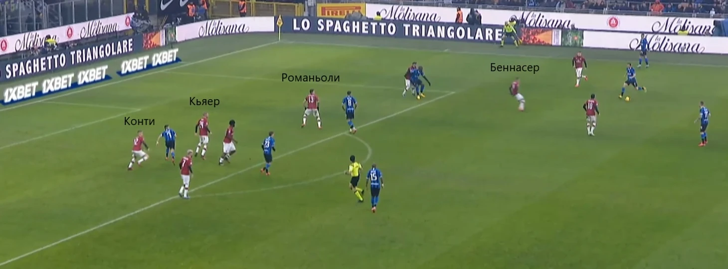 Также на скриншоте бросается в глаза отсутствие опеки за Янгом, который уже поднял руку и ожидает заброса от своего партнера. Большая вина за это лежит на Кессье, который расположился внутри своей штрафной, не выполняя абсолютно никаких функций. Хотя по-хорошему именно в этом эпизоде он должен был следить за Санчесом, предоставив опеку за англичанином для Конти. Это позволило бы Кастильехо не бросать центральную зону вблизи штрафной, где без внимания остались сразу два игрока - Барелла и Брозович.