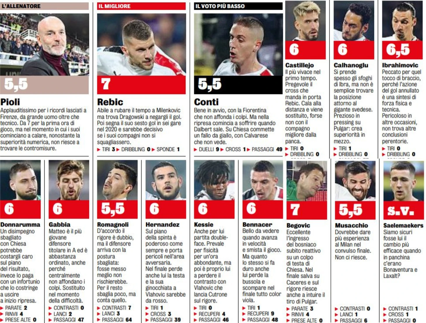 Андреа Конти (худший игрок "Милана" в матче) - оценка 5,5 из 8. Хорошо начал игру против "Фиорентины", которая не создала ничего в начале матча. Но во втором тайме начинает сильно страдать, когда Далберт берется прорываться по флангу. За нарушение на Кьезе должен был получить желтую, но Кальварезе не заметил этот эпизод.