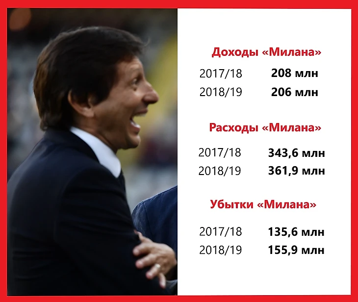 Например, в сезоне 2017/18 «Милан» отчитался об убытках в 135,6 млн евро при доходах в около 208 млн евро – это значит, что расходы клуба за этот период составили около 343,6 млн евро. А в сезоне 2018/19 клуб понес убытки на сумму в 155,9 млн евро при доходах в около 206 млн евро – то есть, расходы за отчетный период составили приблизительно 361,9 млн евро. От этих цифр в дальнейших расчетах и будем отталкиваться.