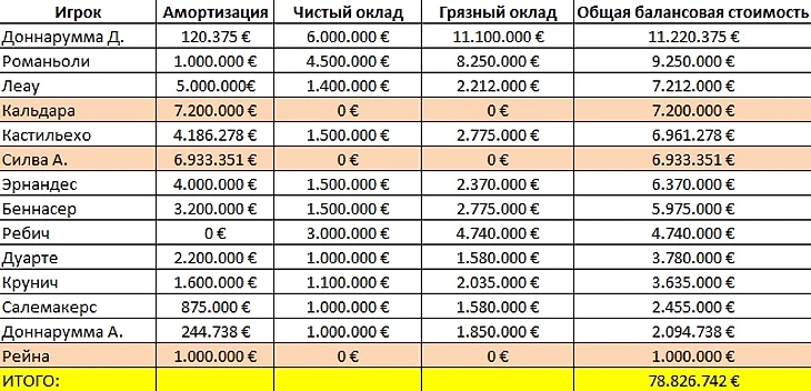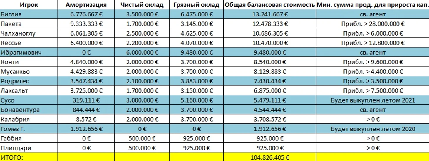 Если каждый из вышеуказанных игроков покинет «Милан» в грядущее окно, то баланс клуба сократится практически на 105 млн евро. Так будет выглядеть оставшийся после чистки состав клуба и, собственно, расходы на него (розовым выделены игроки, которые по плану будут находиться в арендах в других клубах):