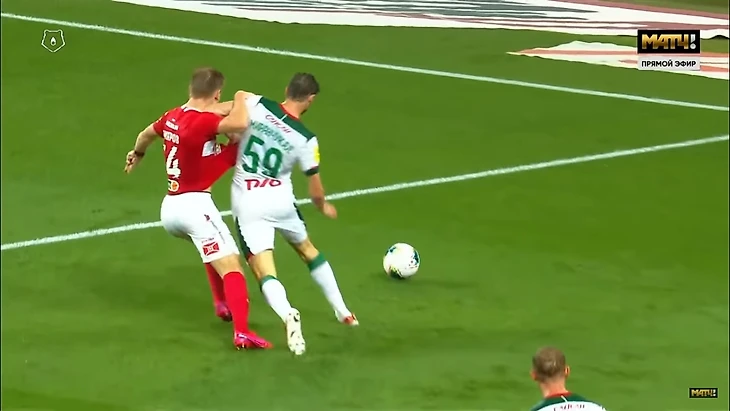 Помимо уже упоминаемой ранее базовой скорости Миранчука, ему также присущ один очень важный навык для его позиции – умение прорываться за счет габаритов через защитников. Ниже фото момента со вчерашнего матча «Локо» против «Спартака»: Алексей за счет своей физической мощи буквально протащил на себе пару метров защитника красно-белых Умярова и упал только в штрафной, заработав для своей команды пенальти, который сам и реализовал.