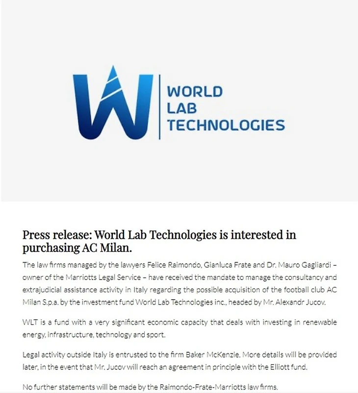 Всё дело в том, что в сегодняшнем пресс-релизе, опубликованном Феличе Раймондо сообщается, что юридические фирмы, которыми управляют юристы Феличе Раймондо, Джанлука Фрейт и доктор Мауро Гальярди, получили мандат на консультирование компании World Lab Technologies Inc., возглавляемой молдавским бизнесменом и инвестором Александром Жуковым. Консультирование якобы должно осуществляться по вопросам, касающимся возможного приобретения «Милана».