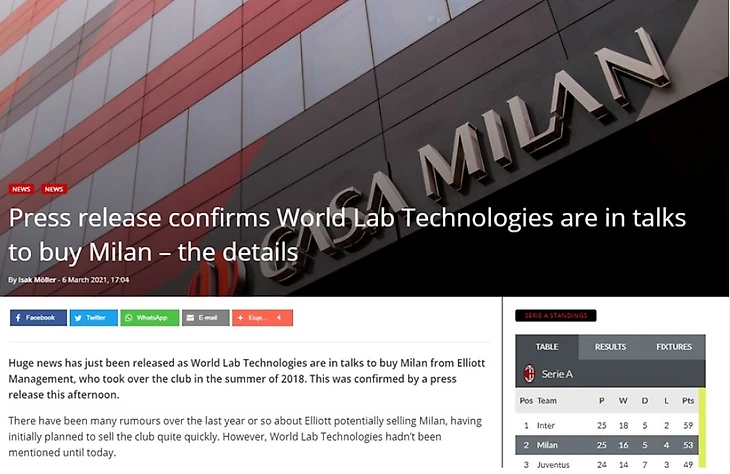 World Lab Technologies на своём сайте объявила об интересе к приобретению клуба ещё в августе прошлого года, но этого никто не заметил. Упоминаний в СМИ об этом не найдено.
