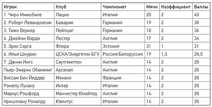 Сейчас в нем лидирует Чиро Иммобиле, опередивший Роберта Левандовски. Нападающий «Лацио» набрал 40 баллов, забив 20 мячей в чемпионате Италии. Обладатель главных призов последних трех сезонов Лионель Месси пока делит 13-е место. В десятку лучших вошел Криштиану Роналду.